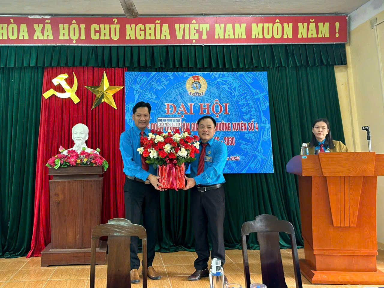 Đại hội vinh dự được đón tiếp đồng chí Huỳnh Tấn Lịch – Chủ tịch Công đoàn phường Bàn Thạch về dự và tặng hoa chúc mừng. Sự hiện diện và tình cảm của đồng chí là nguồn động viên lớn đối với tập thể đoàn viên công đoàn Trung tâm, khẳng định sự quan tâm, đồng hành của Công đoàn cấp trên đối với hoạt động của đơn vị.